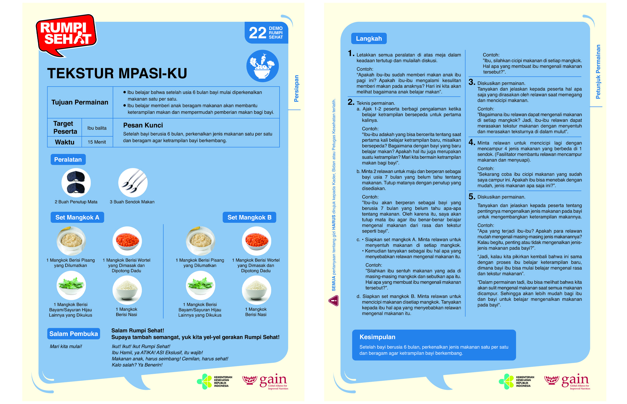 Modul permainan dan alat peraga Emo-Demo ‘Tekstur MPASI-Ku’ mengedukasi ibu dalam mengembangkan keterampilan bayi untuk mengenal tekstur makanannya satu per satu dan beragam. Menganalogikan ibu sebagai bayi yang diminta untuk mengenal makanan dengan mencicipi satu per satu dan dicampur, kemudian menebak jenis makanan dengan menyentuh dan mencicipinya dengan mata tertutup, menunjukkan pada ibu bahwa bayi sangat membutuhkan bantuan ibu dalam mengembangkan keterampilan makannya.