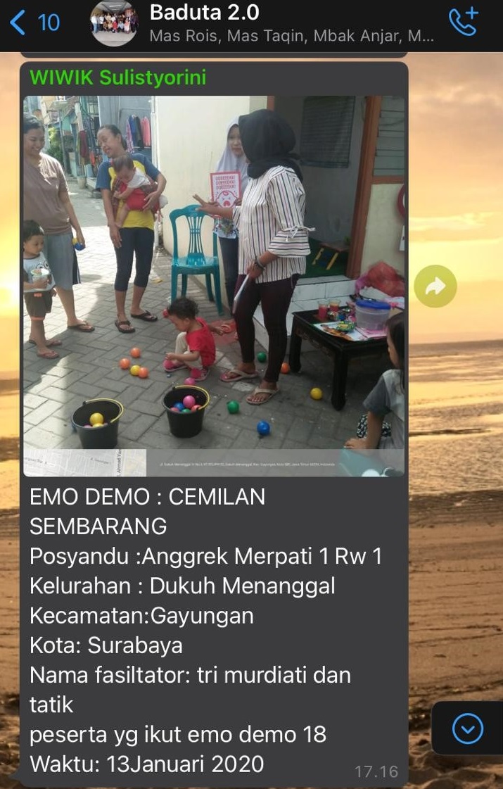 Sesi Emo-Demo dilaksanakan di Posyandu sebulan sekali, bersamaan dengan sesi monitoring pertumbuhan. Salah satu metode pemantauan kegiatan Emo-Demo di Posyandu adalah melalui WhatsApp grup. Aplikasi WhatsApp digunakan sebagai salah satu media pelaporan dan umpan balik untuk implementasi Emo-Demo, karena lebih efektif, efisien dan real time dalam penyampaian informasi kegiatan. Selain itu, aplikasi ini digunakan karena pelaporan manual dirasa kurang efektif pada program dengan wilayah implementasi yang luas, sehingga Whatsapp grup dipilih untuk pelaporan kegiatan. WhatsApp grup memudahkan transfer informasi dalam bentuk foto, video, dan file (word, powerpoint, dan excel). Selain itu data yang terkumpul mudah untuk dipindahkan dan dianalisa. Tujuan penggunaan WhatsApp grup adalah sebagai media komunikasi, informasikan capaian program, menejemen pembelajaran, dan update informasi terkini terkait program. Informasi ini digunakan untuk mengevaluasi pelaksanaan Emo-Demo serta sebagai dasar rencana tindak lanjut pemerintah kabupaten/kota untuk memastikan kelancaran pelaksanaan kegiatan.