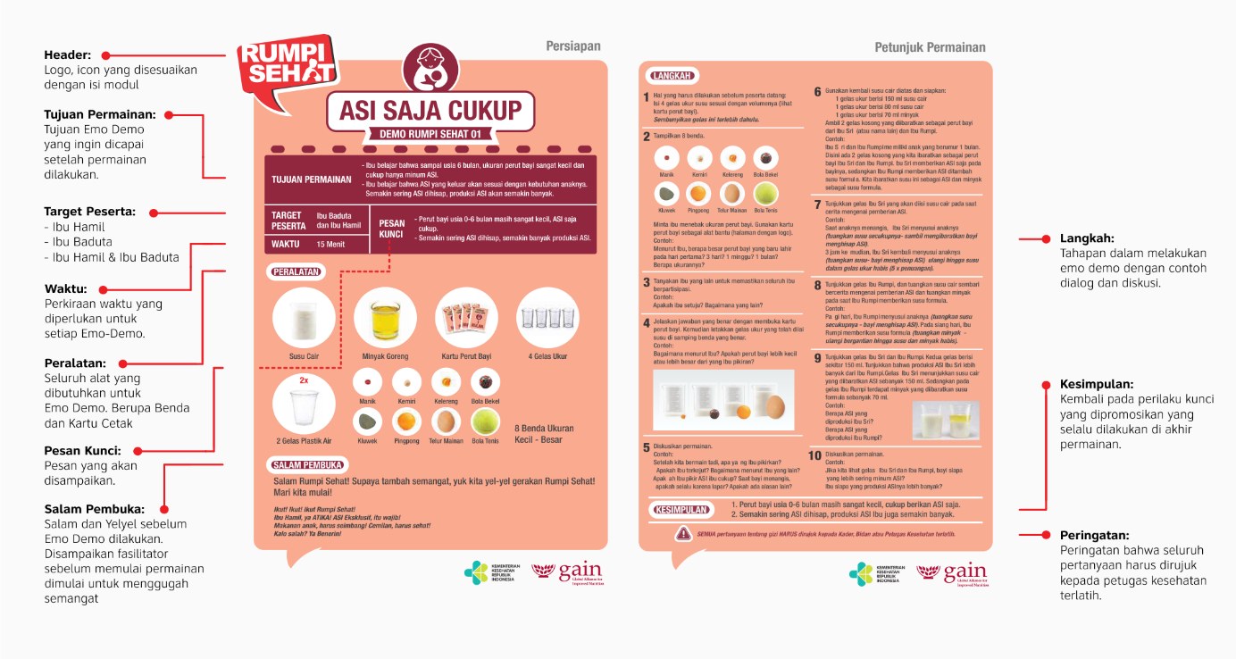 GAIN telah mengembangkan 24 modul permainan Emo-Demo yang dikelompokkan menjadi 6 kategori berdasarkan perilaku target yang ingin diubah.