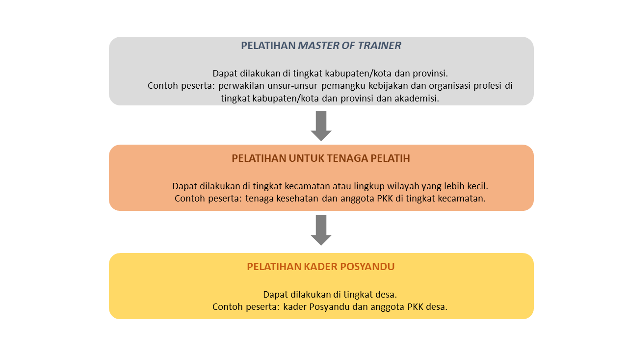 Jika Anda tertarik untuk mengadopsi strategi pelatihan berjenjang, temukan penjelasan singkat pada skema berikut ini. Materi pelatihan dibuat sesuai dengan sasaran peserta di masing-masing jenjang.